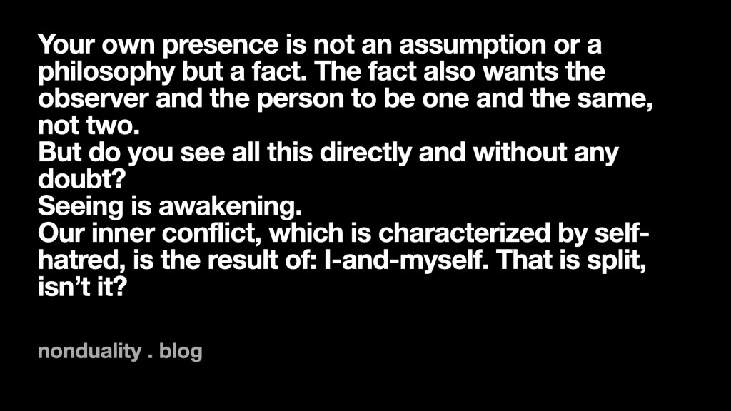 Our inner conflict, which is characterized by self-hatred, is the result of: I-and-myself. That is split, isn’t it?