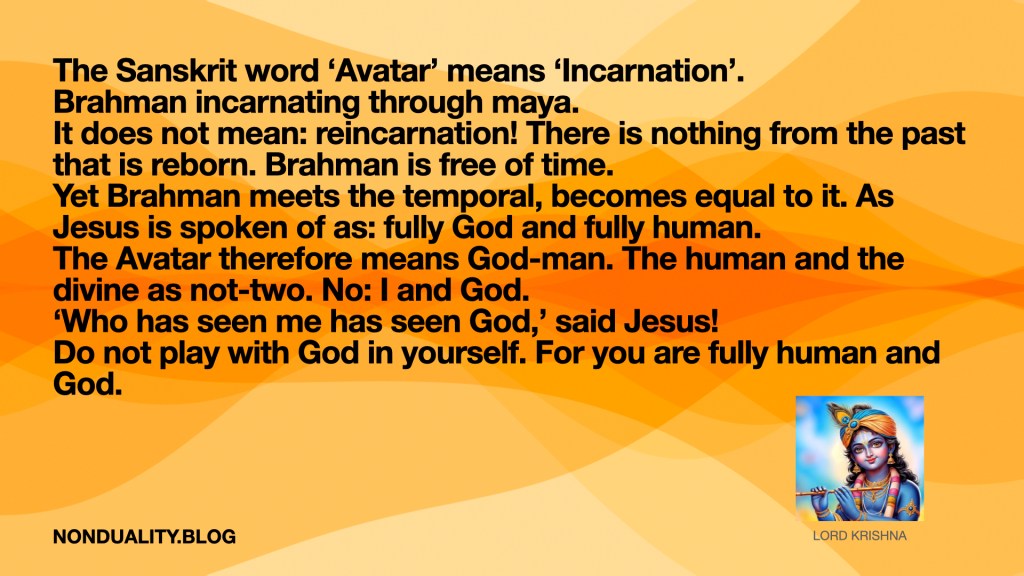 The Sanskrit word ‘Avatar’ means ‘Incarnation’. Brahman incarnating through maya.