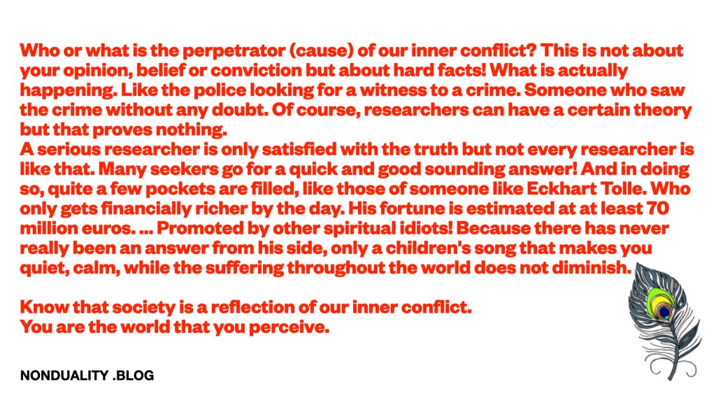 A serious researcher is only satisfied with the truth but not every researcher is like that. Many seekers go for a quick and good sounding answer! And in doing so, quite a few pockets are filled, like those of someone like Eckhart Tolle. Who only gets financially richer by the day. His fortune is estimated at at least 70 million euros. … Promoted by other spiritual idiots! Because there has never really been an answer from his side, only a children’s song that makes you quiet, calm, while the suffering throughout the world does not diminish.