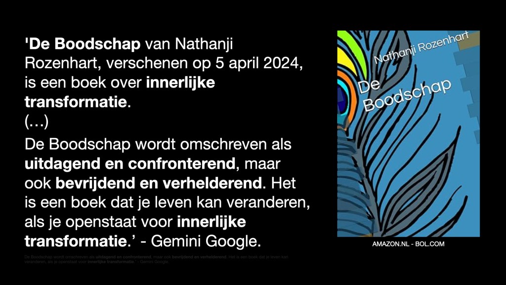 ‘De Boodschap is een uitdagend en confronterend boek, maar het kan ook een zeer bevrijdende en verhelderende ervaring zijn. Het is een boek dat je leven kan veranderen als je bereid bent om je open te stellen voor de mogelijkheid van innerlijke transformatie.’ – Google Gemini.